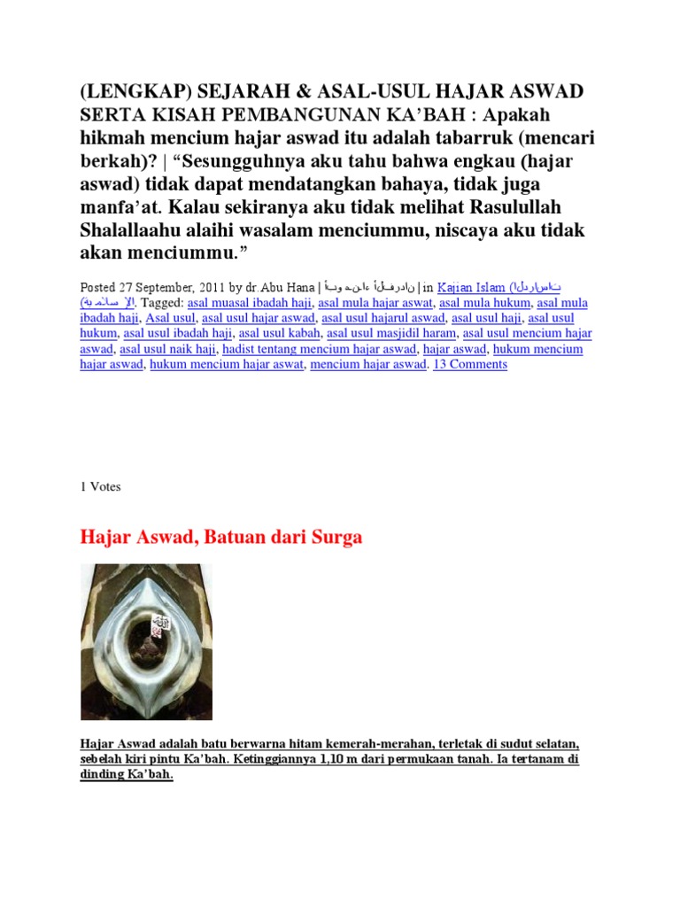 Bentuk hajar aswad ini awalnya adalah sebongkahan batu besar, namun setelah terjadi penjarahan pada tahun 317 h, batu hajar aswad kini menjadi delapan bongkahan batu kecil. Darinya dimulai thawaf, dan sekarang tinggi diatas bumi satu meter setengah. Hajar aswad merupakan sebuah batu yang diyakini oleh umat islam berasal dari surga, dan yang pertama kali menemukannya adalah nabi ismail dan yang meletakkannya adalah nabi ibrahim. Keunikan dari batu hajar aswad adalah aromanya yang khas dan awet bahkan semenjak diturunkannya. Batu tersebut aslinya berwarna putih. Asal usul hajar aswad ustadz abdul somad, lc. Hajar aswad merupakan jenis batu 'ruby' yang diturunkan allah dari surga. Hajar aswad, batuan dari surga. Hajar aswad adalah pelopor biro umroh dan haji di solo dan semarang sejak 17 oktober 2012 dan alhamdulillah telah dipercaya sekitar 4500 jamaah. Ar rayyan ini adalah salah satu pintu di surga dari delapan pintu yang ada yang disediakan khusus bagi orang yang. Hajar aswad merupakan salah satu batu yang diyakini oleh umat islam berasal dari surga, dan yang pertama kali menemukannya adalah nabi ismail dan yang meletakkannya adalah nabi ibrahim. Sehingga ini menunjukkan bahwa hajar aswad bukanlah tangan kanan allah ta'ala yang sesungguhnya 18. Hajar aswad adalah batu hitam kemerahan yang terletak di salah satu sudut ka'bah yang dekat dengan pintu masuk.